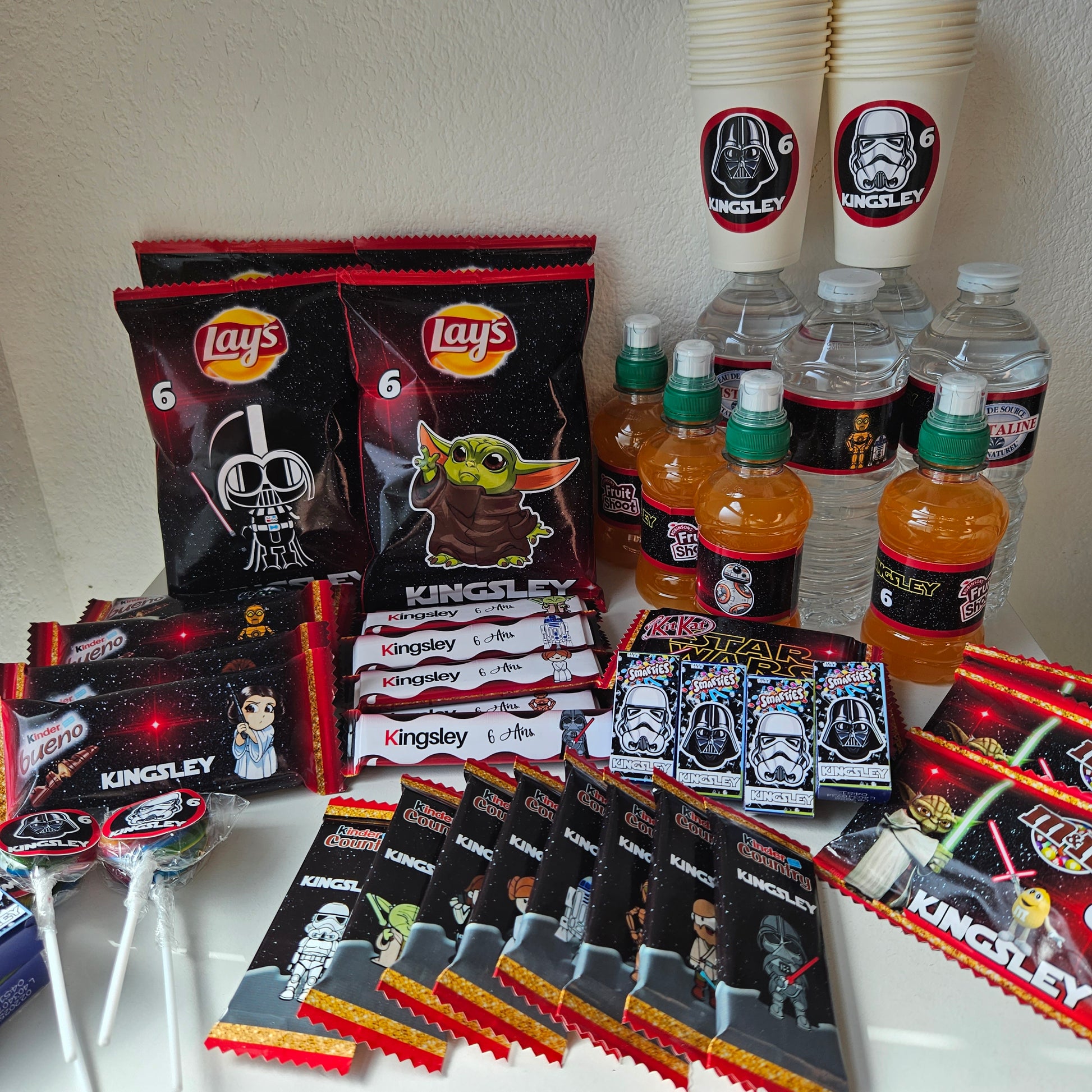 Le Kit Anniversaire est composé de: - Smarties, mignonettes Milka, gobelets, pailles, kits serviettes/fourchette/ronds serviette, assiettes sucettes, étiquette fruit-shoot ou petite bouteille d'eau